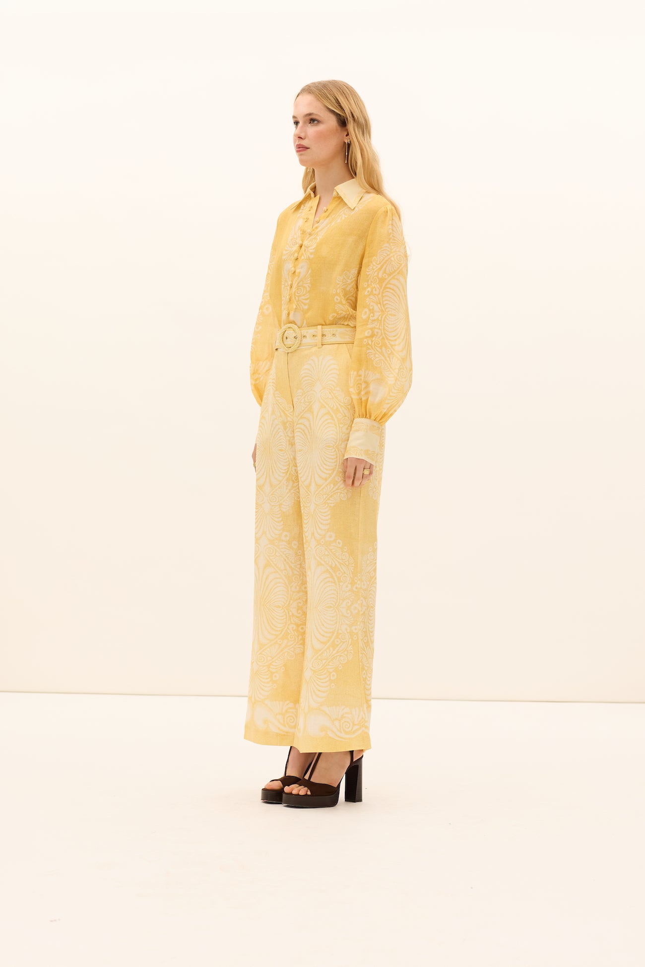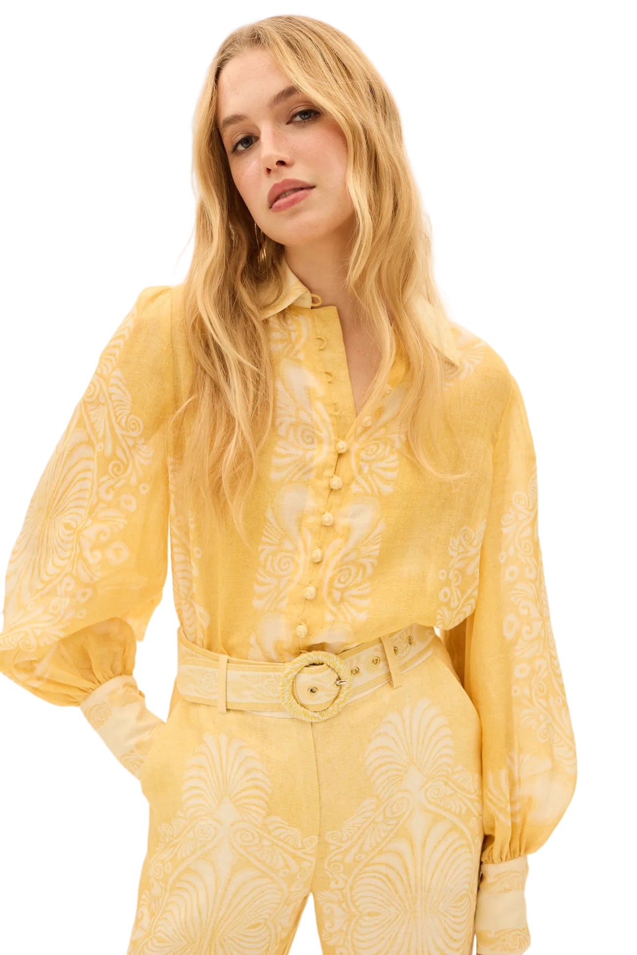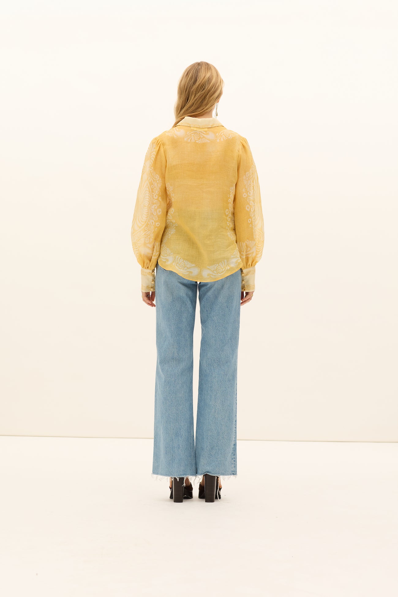The Mimosa Collar Blouse in Verbena, a Kate Ford exclusive hand-drawn placement print from our Collection 'Fiorire'. A light weight ramie blouse with a pointed collar, self covered buttons on placket, volume sleeves and cuffs.