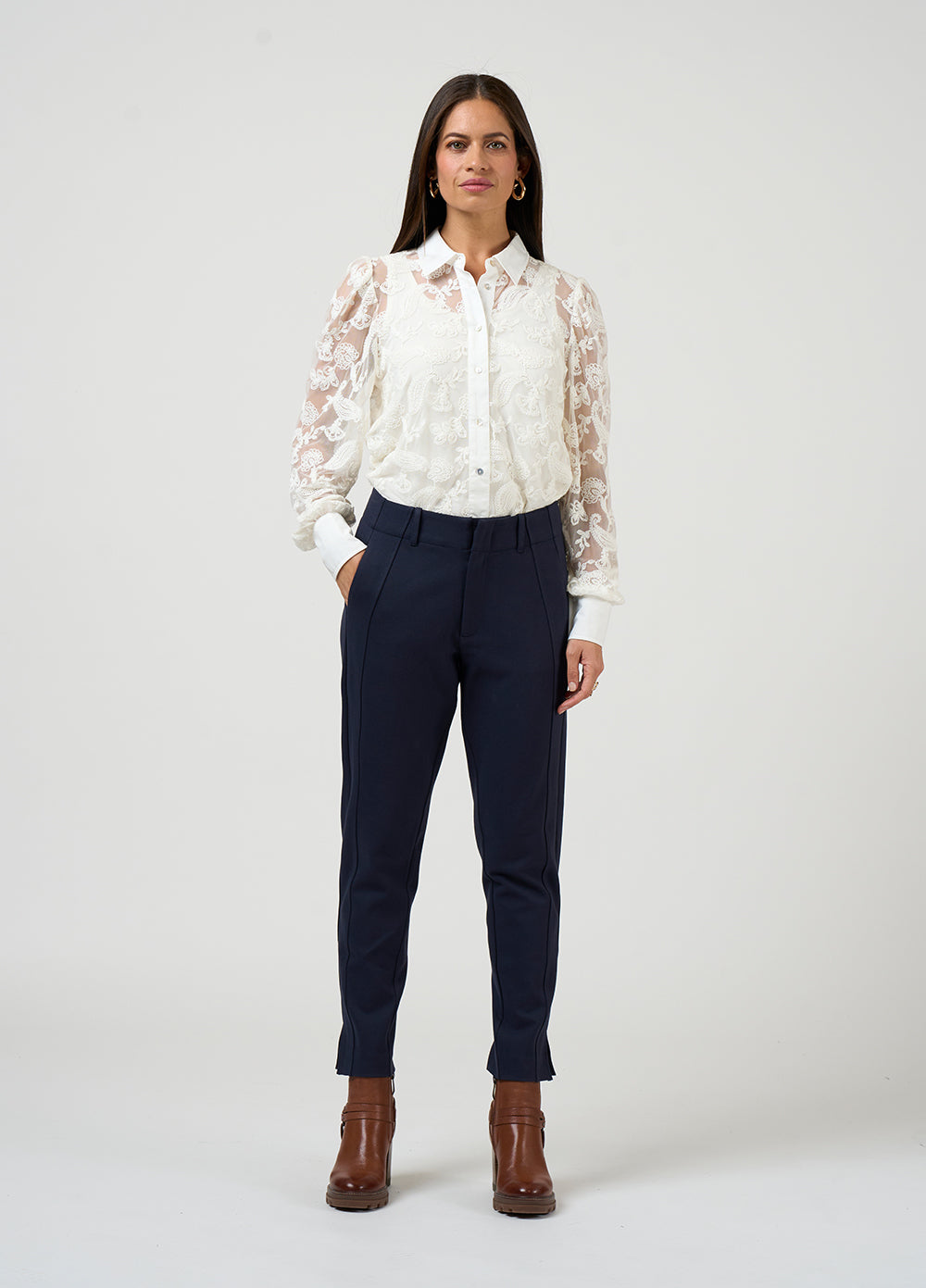 Embroidered tulle shirt with a crisp cotton sateen collar, button placket, and deep cuffs. The embroidery is placed to stop short of the hem, creating a subtle border. Comes with colour-matched A-line cami.