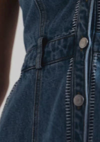 Crafted from mid-weight cotton denim, the Hendrix Dress features a V-neckline, sleeveless bodice, and button-front design. Embroidery detailing adds texture, while a fitted waist and A-line midi skirt with slant pockets create a flattering silhouette.
