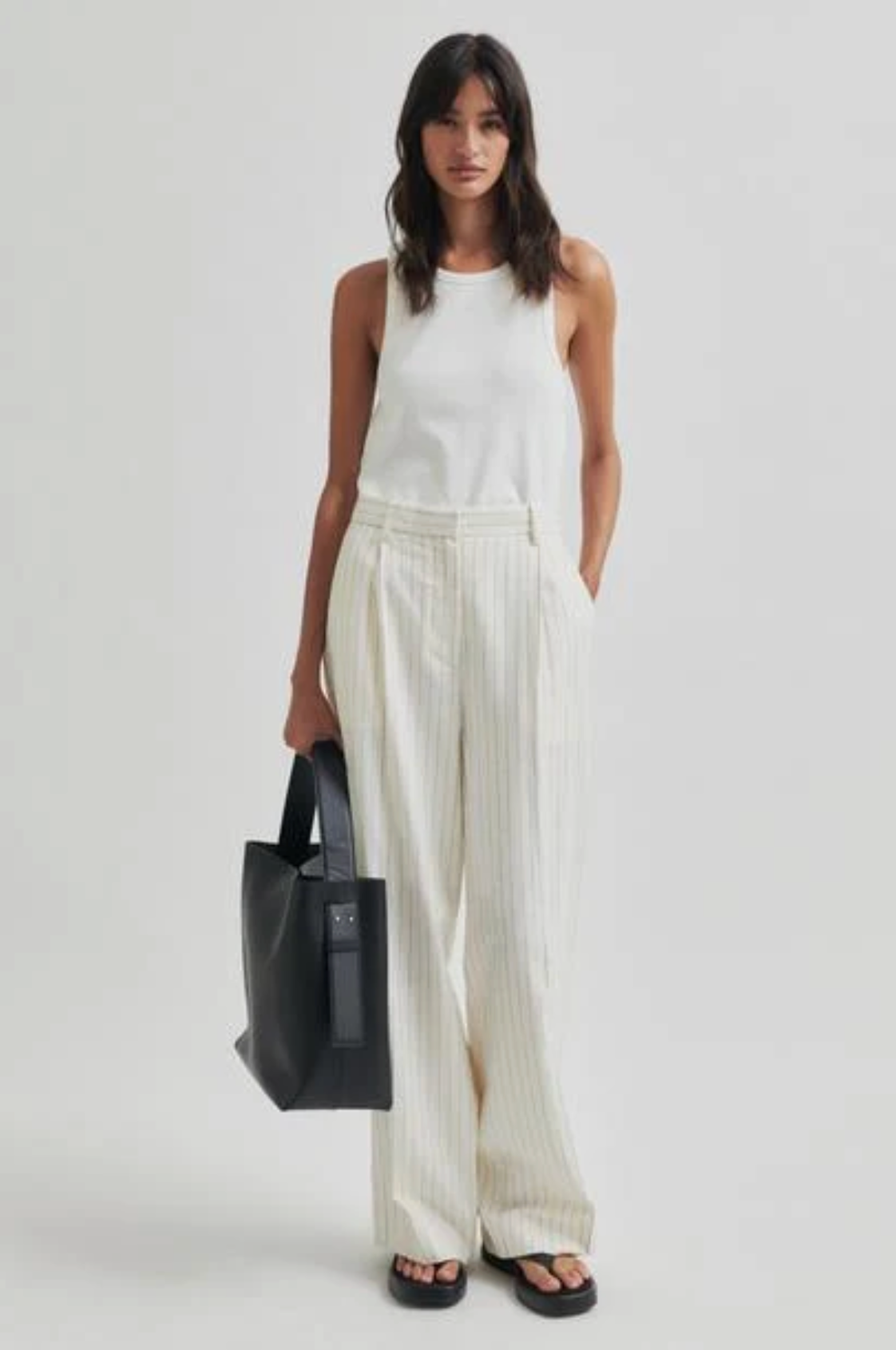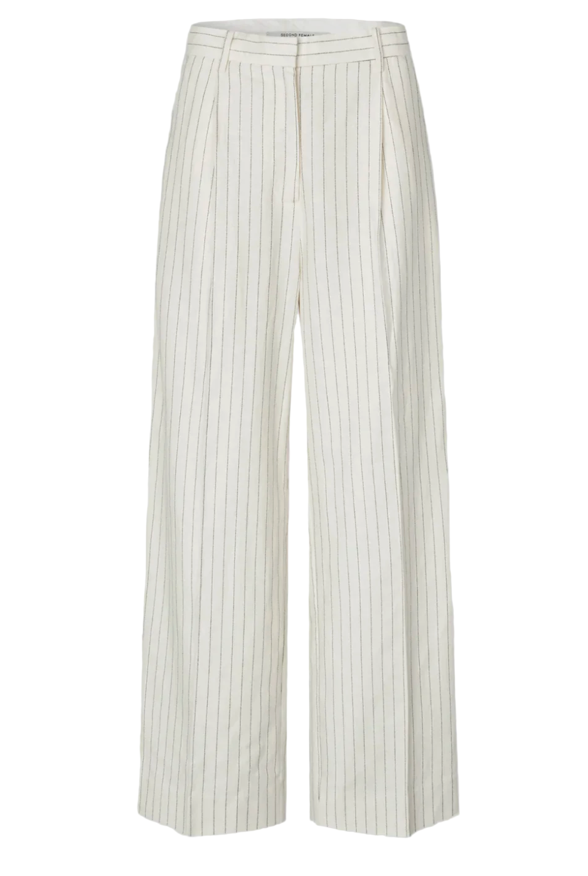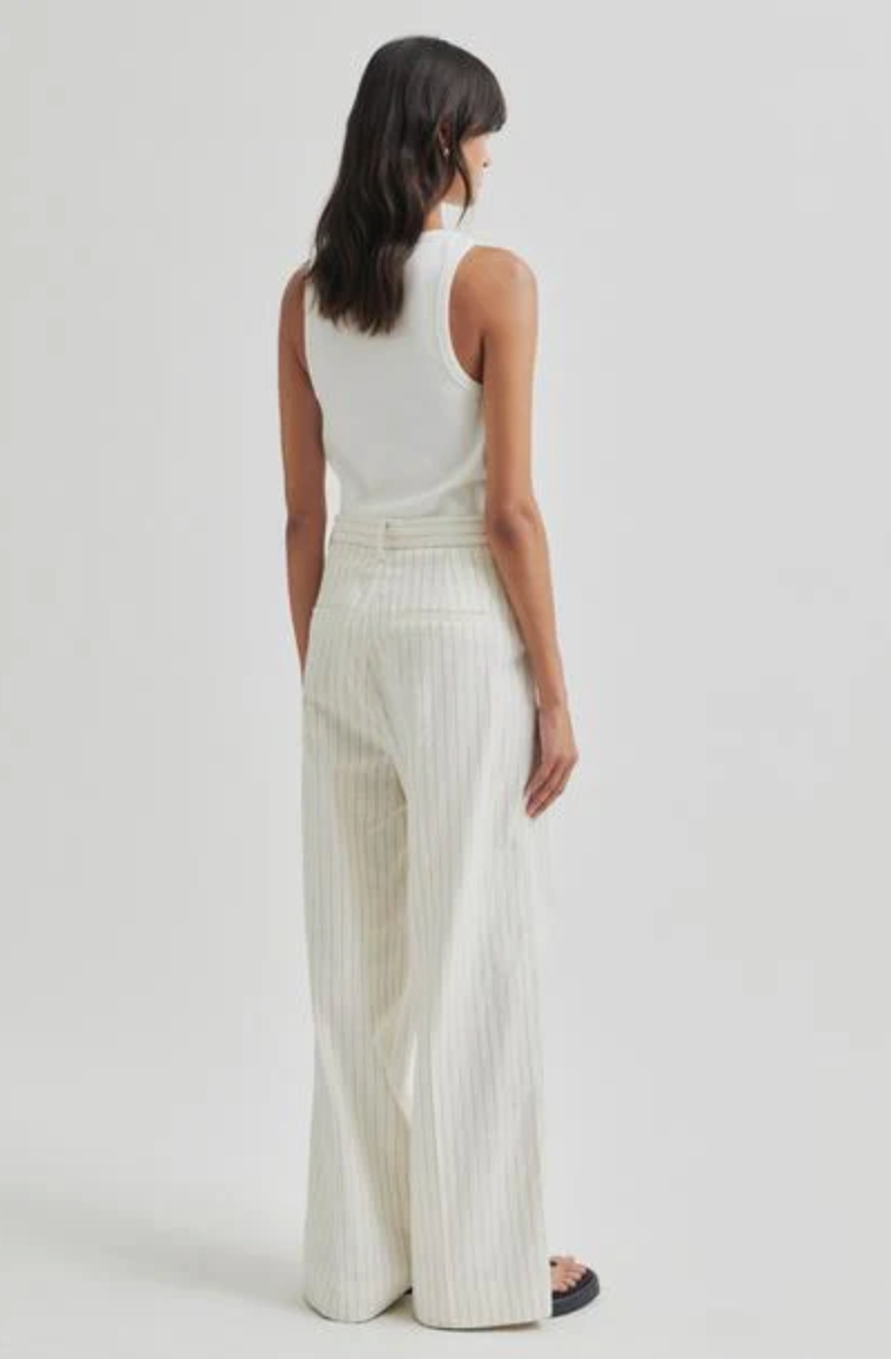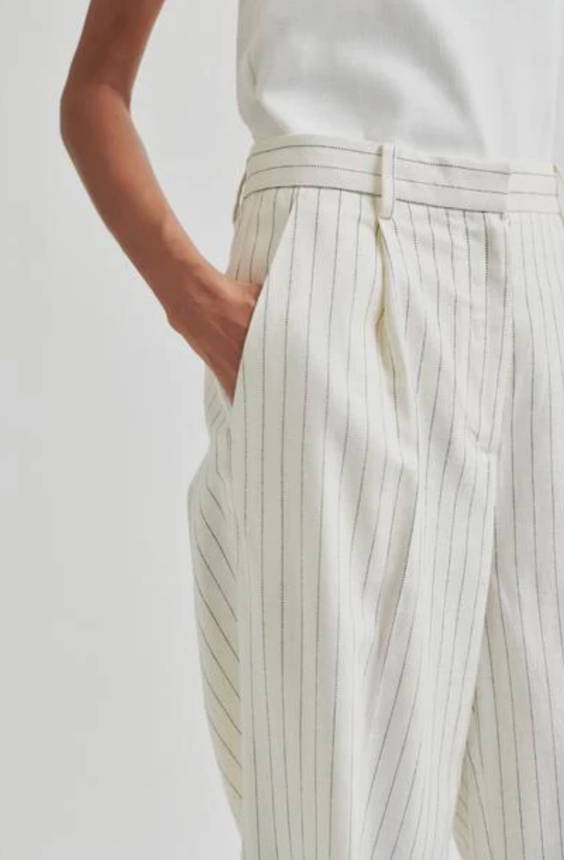 Second Female striped trousers. The trousers are made in a striped cotton-linen blend. Featuring a concealed zip, hook and button closure at the front. Two slanted pockets at the front and two decorative pockets at the back. Mid waist with wide, straight legs.