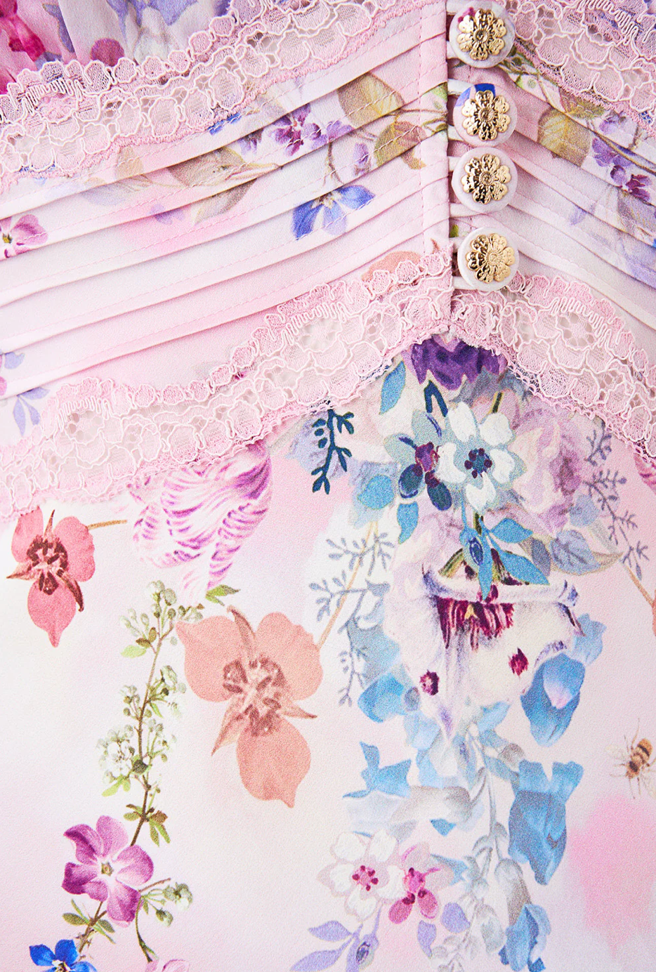 The Palatial Pastels Bias Cut Midi Dress With Lace Insert is a handcrafted silhouette designed by our in house artisans. Reimagined in an exclusive limited edition print, this v neck dress is cut as a fitted style and features delicate lace detailing. Its adorned with short sleeves and finished with intricately placed crystal embellishment for luminous detail.