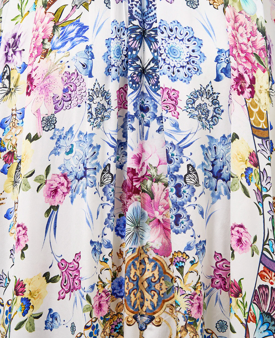 The All About That Lace Shaped Waistband Dress With Gathered Sleeves is a handcrafted silk silhouette designed by our in house artisans. Reimagined in an exclusive limited edition print, our shaped waistband dress features a V neckline, framed by a front button fastening that meets a shirred back for adjustable comfort. Its soft, gathered sleeves cascade beside the form, adding fluidity with every step, its finished with delicate frills and intricately placed crystal embellishments for romantic allure.