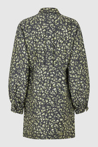 Second Female patterned dress. Made in smooth material with an all over pattern. With pointed collar and button closure down the front. Wide balloon sleeves with buttoned cuffs. Two large patched breast pockets and two patch pockets in the hem of the skirt. Solid color edging at the collar and patch pockets. Regular fit with slightly shaped waist and straight skirt.